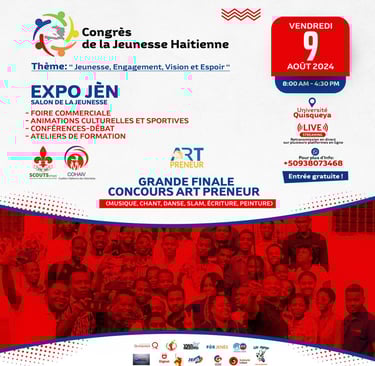 Le "Congrès de la Jeunesse Haïtienne" est une initiative destinée à mobiliser, conscientiser et inclure les jeunes Haïtiens dans le processus de développement du pays. Organisé sous le thème « Jeunesse, engagement, vision et espoir », cet événement vise à offrir une plateforme d'expression aux jeunes, à mettre en lumière leurs réussites, et à encourager leur participation dans la vie économique et sociale.