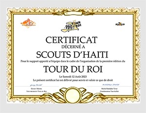 Certificat décerné aux Scouts D'Haïti ( District Cap-Haïtien ll) pour la participation Tour du Roi , le 12 Août 2023.